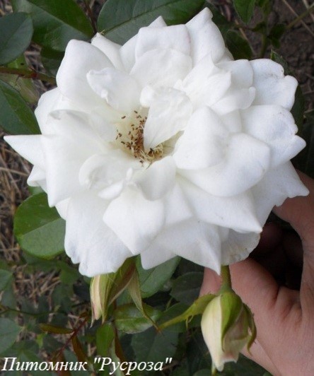 Цветок: чисто белый перламутровый с желтыми тычинками, плоский до плоскочашевидного, махровый, 17 - 25 лепестков в одном цветке, диаметр цветка 4 - 6 см, обладает ароматом, привлекательный для пчел и шмелей.