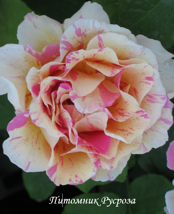Цветок: кремово-желтый с красно-розовыми и оранжевыми полосами, чашевидный, с высоким центром, махровый, 20 - 25 лепестков в одном цветке, диаметр цветка 9 - 10 см, обладает насыщенным фруктовым ароматом с нотками цитрусовых и ванили.