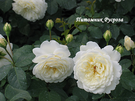 Цветок: кремово-белый с легким лимонно-желтым оттенком, по мере распускания становится чисто-белым, шаровидный до розетковидного, густомахровый, 60 - 80 лепестков в одном цветке, диаметр цветка 8 - 10 см, обладает легким ароматом с нотками яблока.