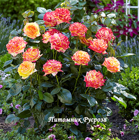 Цветок: сиренево-фиолетовый с красноватым оттенком, чашевидный с волнистым краем лепестка, густомахровый, 80 - 100 лепестков в одном цветке, диаметр цветка 7 - 10 см, обладает насыщенным цитрусовым ароматом, устойчив к дождю.