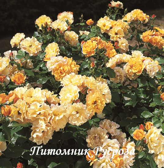 Цветок: одновременно на одном растении можно видеть три цвета: бутон ярко оранжевый, распустившийся цветок нежно желтый с лососевым налетом, перед опадением лепестков кремово-белый, чашевидный, махровый, 27 - 30 лепестков в одном цветке, диаметр цветка 7 - 8 см, без аромата, долго сохраняет форму, пригоден для срезки.