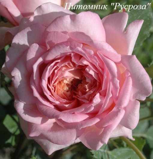 Цветок: нежно-розовый с кремовым центром и золотистым налетом на обратной стороне лепестка, розетковидный, густомахровый, 50 - 100 лепестков в одном цветке, диаметр цветка 10 - 12 см, обладает насыщенным фруктовым ароматом с нотками свежего лимона и малины, долго сохраняет форму, пригоден для срезки.
