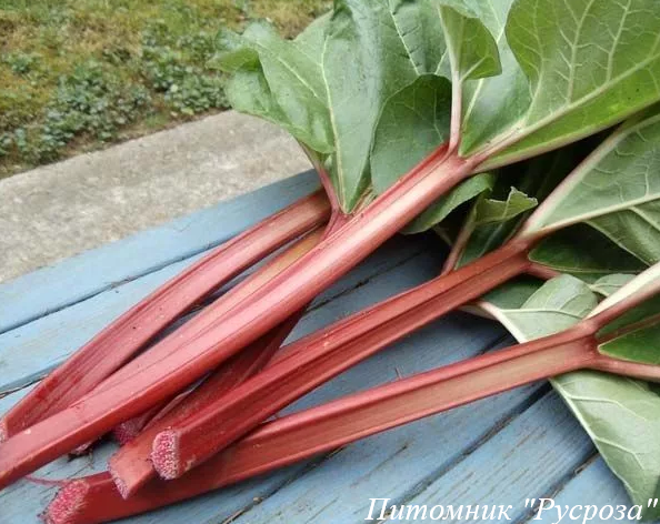 Растение: многолетнее, травянистое, высотой 60 - 80 см. Ярко-красные мясистые черешки съедобны. Листья собраны в розетку, крупные, с выраженным жилкованием, по краю курчавые, сочно-зеленого цвета, очень декоративные.