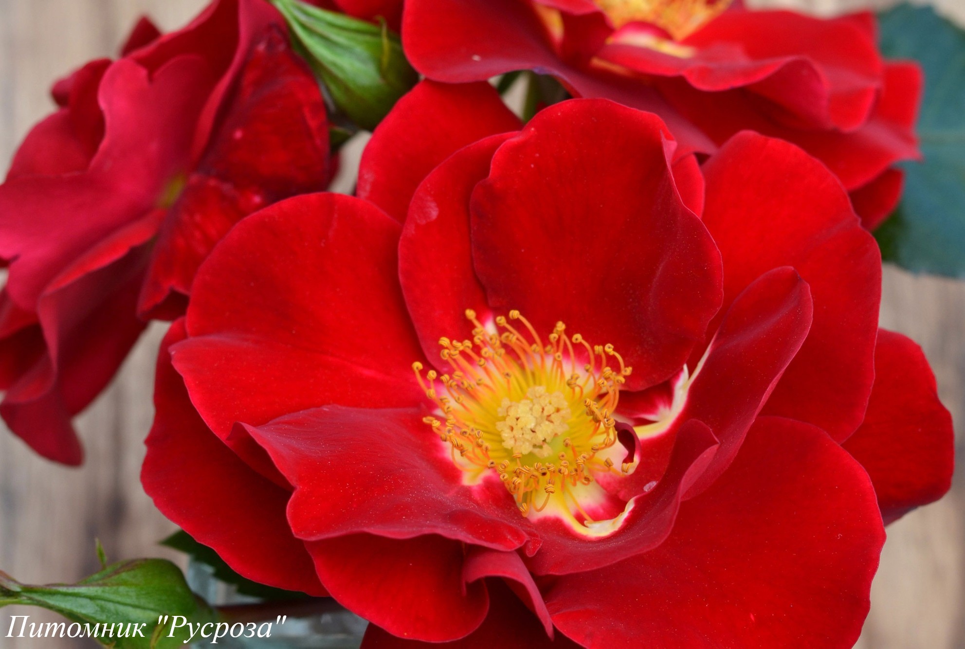Цветок: ярко красный бархатистый с ярко желтыми тычинками, плоскочашевидный, полумахровый, 9 - 16 лепестков в одном цветке, диаметр цветка 4 - 7 см, без аромата, привлекательный для пчел и шмелей.
