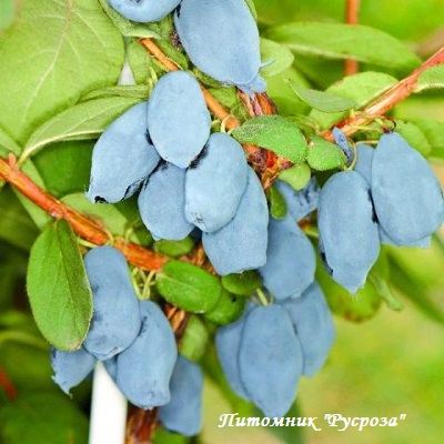 Ягода: крупная, массой до 2,5 г, темно-синяя с восковым налетом, удлиненно-цилиндрической формы, с округлым основанием и слабобугристой поверхностью. Кожица тонкая, плотная. Мякоть нежная, сладкая, с сильным ароматом, волокнистой консистенции.