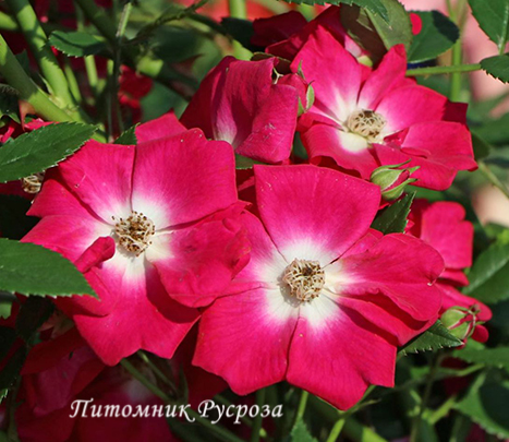 Цветок: розово-красный до карминово-розового с белым центром и золотистыми тычинками, плоский, простой, 4 - 8 лепестков в одном цветке, диаметр цветка 3 - 5 см, обладает очень легким ароматом, устойчив к неблагоприятным погодным условиям (дождь, ветер), очень привлекательный для пчел и шмелей.