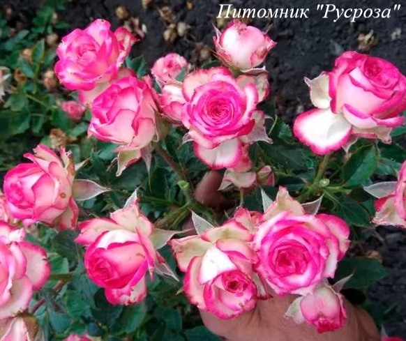 Цветок: кремовый с розовым напылением и темно-розово-малиновым краем лепестка, чашевидный, с высоким центром, густомахровый, 40 - 60 лепестков в одном цветке, диаметр цветка 5 - 8 см, обладает легким ароматом, долго сохраняет форму, пригоден для срезки.