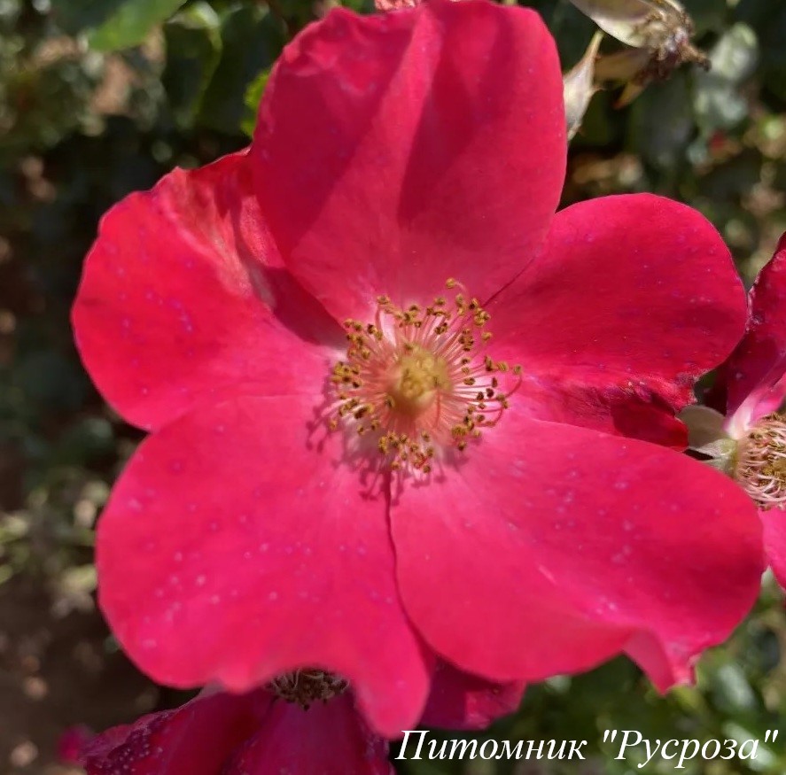 Цветок: ярко розово-малиновый до красного с ярко желтыми тычинками, плоский, простой, 4 - 8 лепестков в одном цветке, диаметр цветка 4 - 6 см, обладает легким ароматом, привлекательный для пчел и шмелей, долго сохраняет форму, пригоден для срезки.
