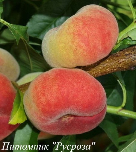 Плоды: крупные (110 - 140 г), дискообразной формы, слегка сплюснутые по бокам. Окраска — жёлтая, с большим малиновым румянцем, который охватывает большую часть поверхности. Мякоть сочная, кремового цвета, с высоким содержанием волокон. Костянка хорошо отделяется от мякоти.