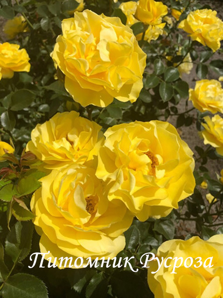 Цветок: золотисто-желтый, шаровидный до чашевидного с волнистым краем лепестка, полумахровый до махрового, 15 - 50 лепестков в одном цветке, диаметр цветка 6 - 7 см, обладает легким ароматом, устойчив к неблагоприятным погодным условиям (солнце, дождь, ветер).