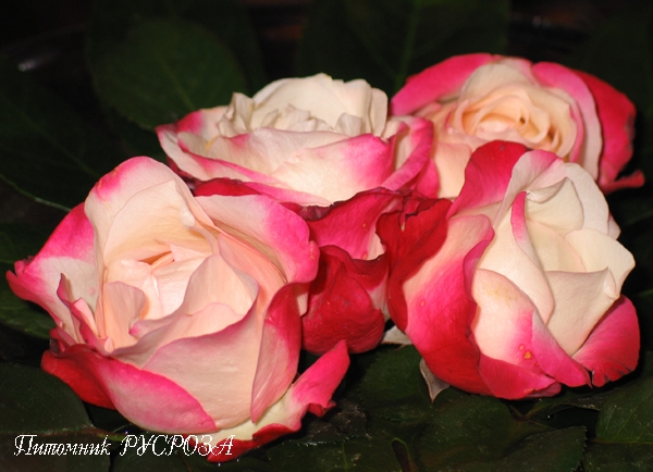 Цветок: нежно-кремово-белый с ярко вишнево-красным слегка волнистым краем лепестка, махровый, 35 - 45 лепестков в одном цветке, диаметр цветка 9 - 11 см, обладает насыщенным сладким ароматом, очень устойчивый к неблагоприятным погодным условиям (солнце, дождь), долго сохраняет форму и цвет.