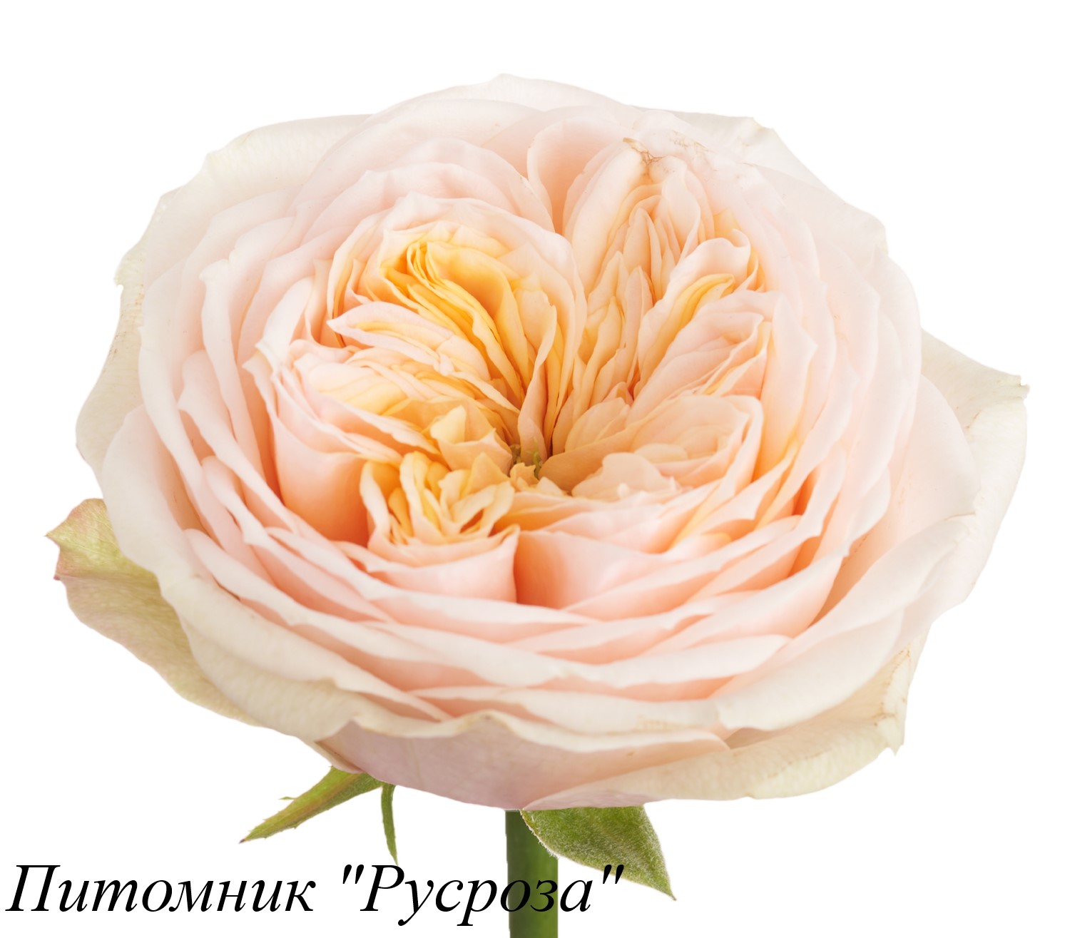Цветок: кремовый перламутровый с кораллово-розовой обратной стороной лепестка, желто-абрикосовым с золотистым оттенком центром и зеленым глазком, розетковидный, густомахровый, 80 - 100 лепестков в одном цветке, диаметр цветка 8 - 10 см, обладает очень легким ароматом, долго сохраняет форму, пригоден для срезки.