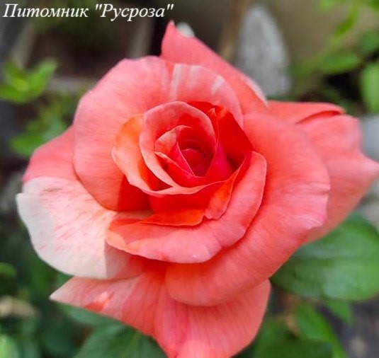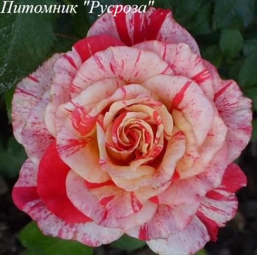 Цветок: красный с желто-оранжевым оттенком, розово-белыми и кремовыми штрихами и полосками, чашевидный, с высоким центром, махровый, 17 - 25 лепестков в одном цветке, диаметр цветка 8 - 10 см, без аромата, долго сохраняет форму, пригоден для срезки.