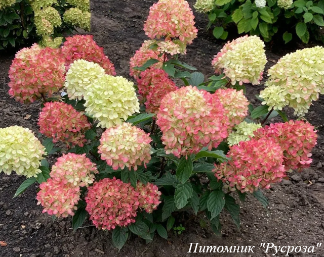 Соцветие: округлые, плотные. Цветки стерильные, светло-зелёные, затем приобретают кремово-белые или розоватые оттенки, а к осени становятся светло-розовыми.