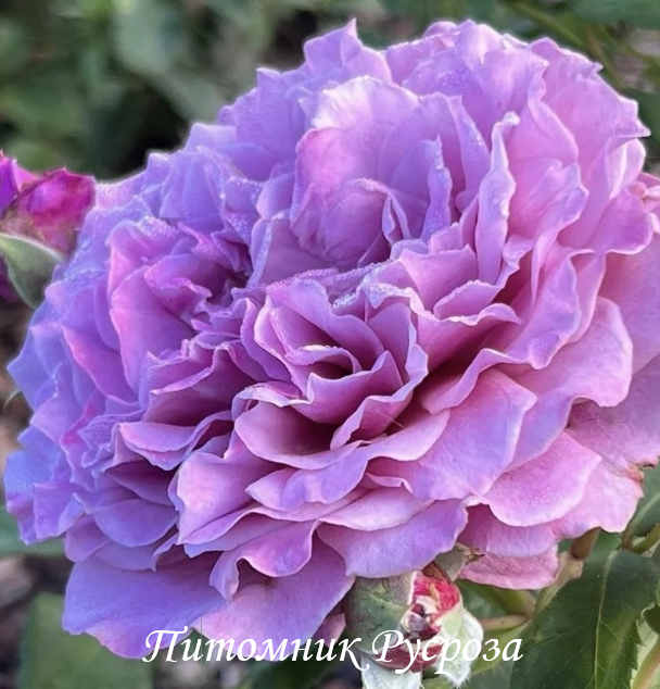 Цветок: сиренево-фиолетовый с красноватым оттенком, чашевидный с волнистым краем лепестка, густомахровый, 80 - 100 лепестков в одном цветке, диаметр цветка 7 - 10 см, обладает насыщенным цитрусовым ароматом, устойчив к дождю.