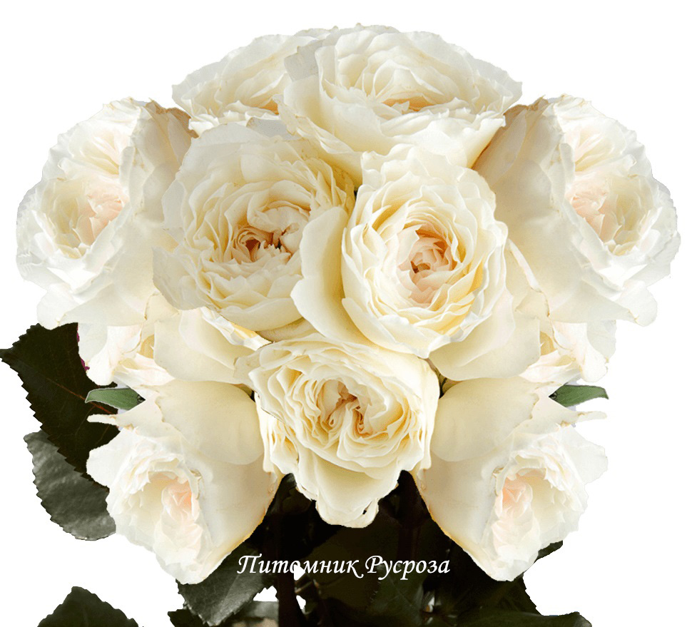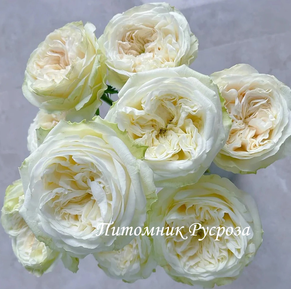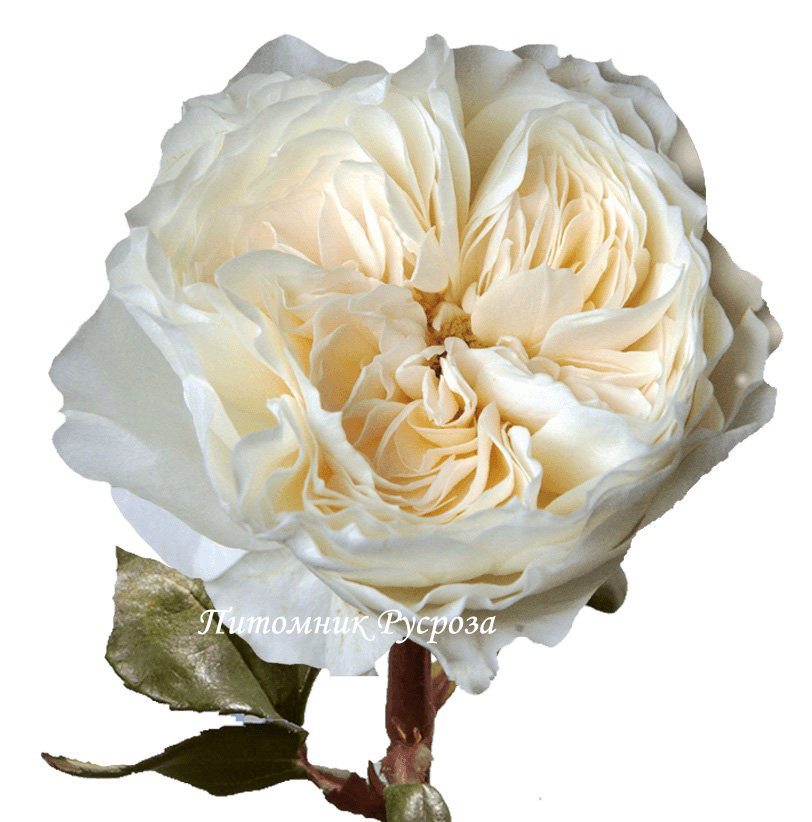 Цветок: белый с персиково-кремовым центром и зеленым глазком, розетковидный до квадратного, очень густомахровый, 100 - 170 лепестков в одном цветке, диаметр цветка 7 - 10 см, обладает ароматом, очень долго сохраняет форму, пригоден для срезки.