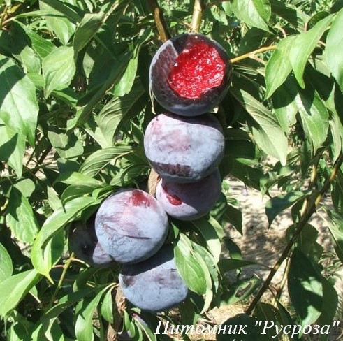 Плоды: крупные (90 - 100 грамм), округлые, темно-фиолетовые, обладают легким ароматом. Мякоть очень сочная, красная.