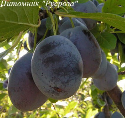 Плоды: крупные (60 - 70 грамм) округло-овальные, с восковым налетом, обладает ароматом. Окраска фиолетовая с голубым оттенком. Мякоть нежная, сочная, желто-зеленая. Лежкость высокая.